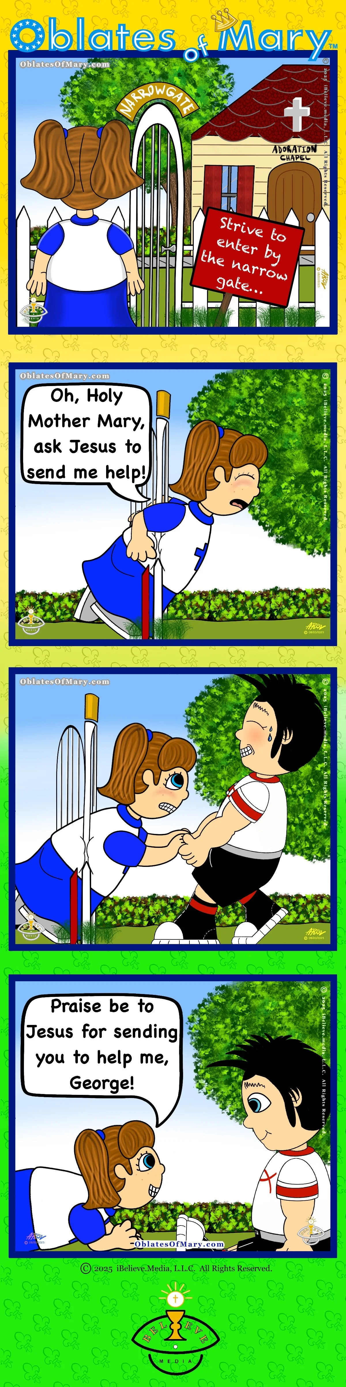 The Narrow Gate: Angelique attempts the path and bumps in to George in this week’s Oblates of Mary comic, inspired by the Mass readings for the 21st Sunday in Ordinary Time, Year C-Luke : 13:24